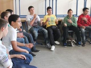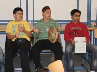 Die Schüler und Schülerinnen arbeiten mit Instrumenten wie z.B. Bongos oder Triangel, lernen Takte, die